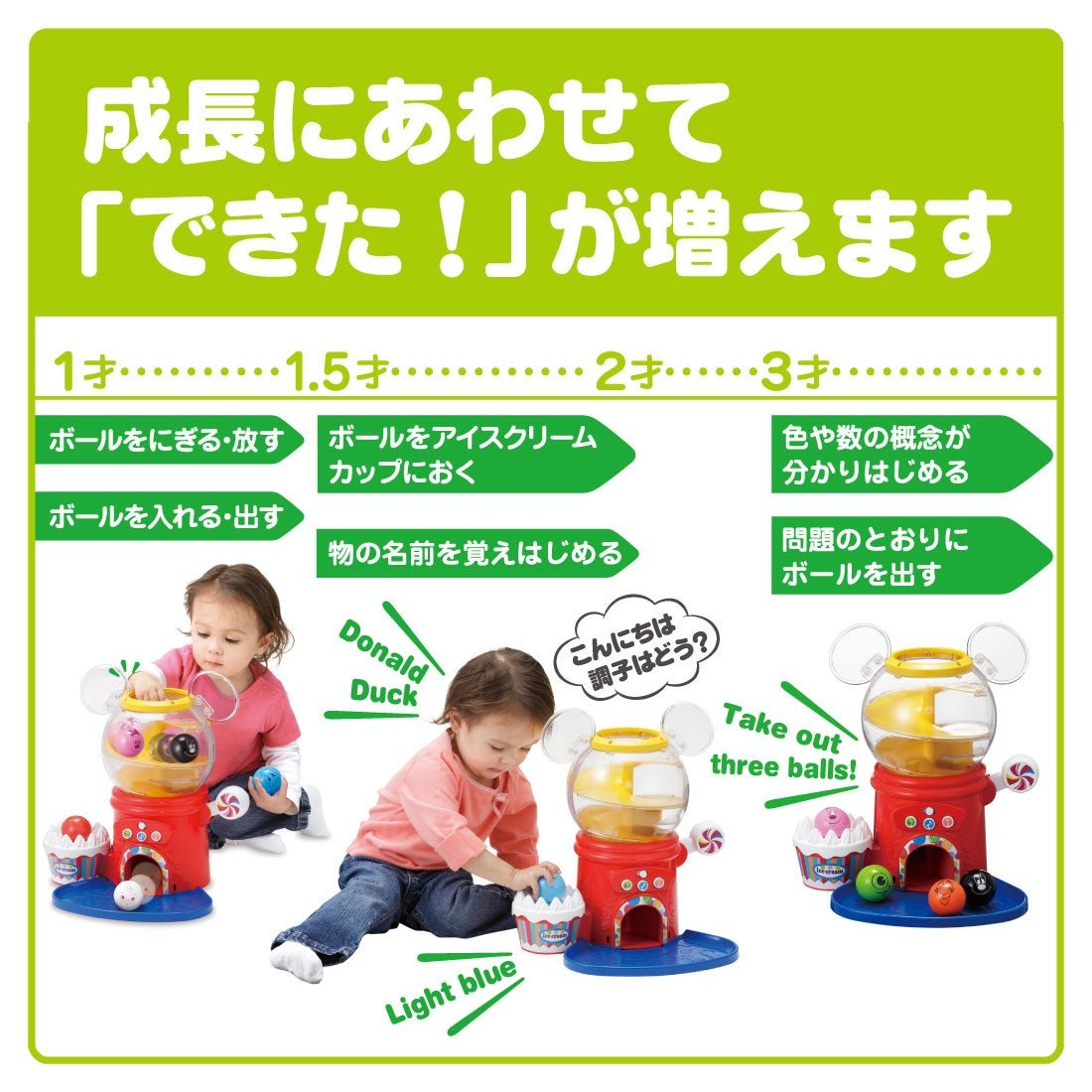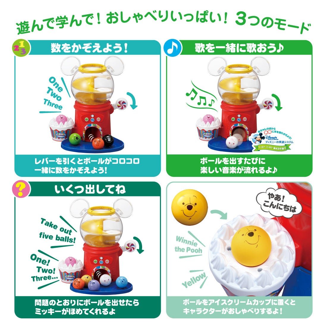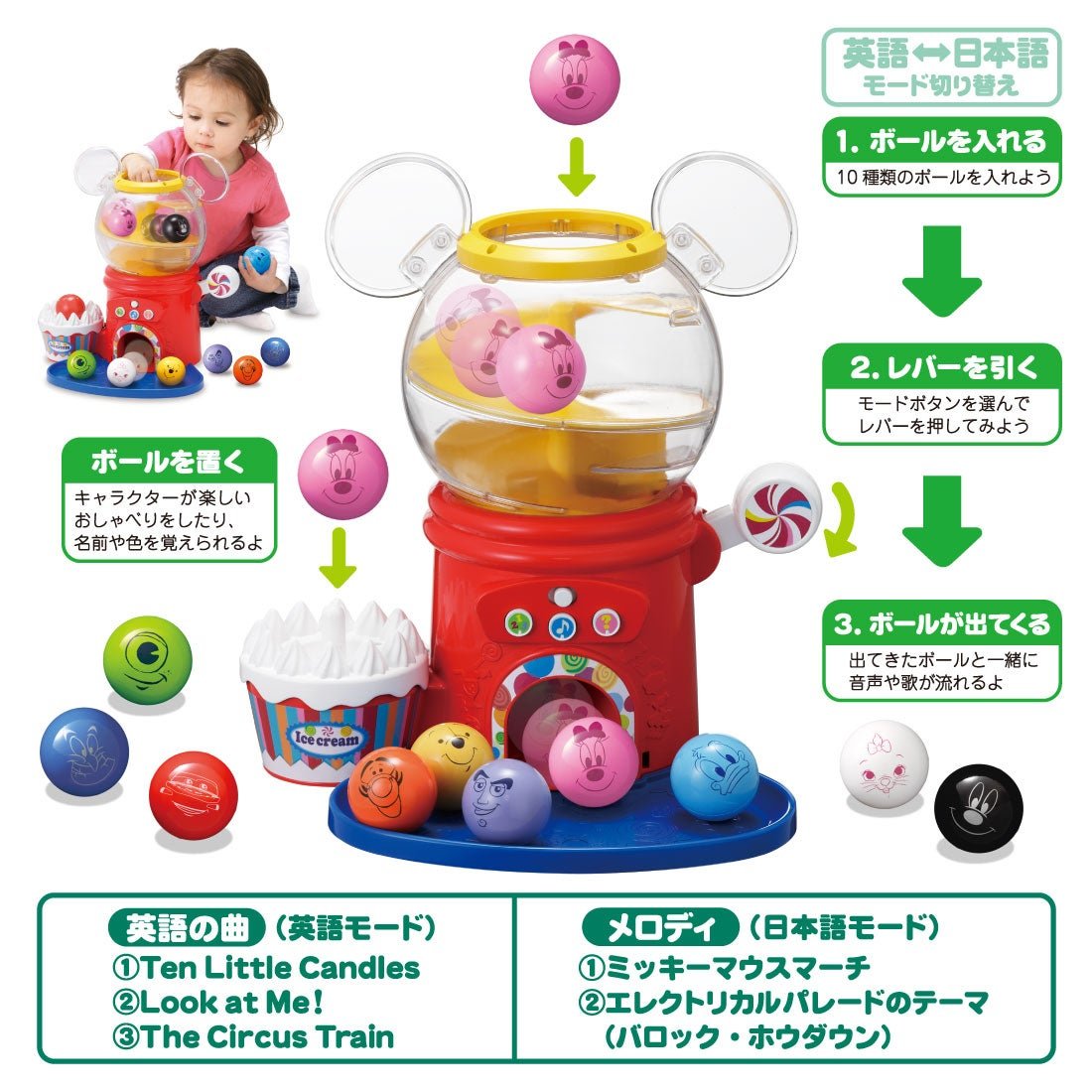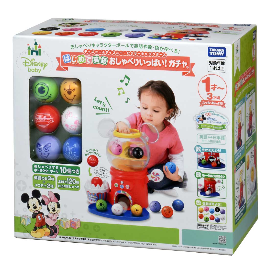 🔥 限時特價中 🔥 👍🏻產品特點👍🏻 🌀玩扭蛋玩具的同時學習英語、數字和顏色。這款益智玩具包含10個印有迪士尼角色的會說話的球 詳情請可參看以下連結🔗 🔽 https://t2m.io/gCNBJsBR 🌀3種球玩法 (1) 數數: 每次放球時數一數。 (2) 一起唱歌: 每次放球時都會播放有趣的音樂和音效。 (3) 有多少? : 如果你正確地釋放球,Mickey會稱讚你。 🌀包含日語和英語模式 🌀包含3首英文歌曲 🌀包含2首迪士尼音樂歌曲 🌀【適用年齡】約1至3歲 📏尺寸📏 包裝尺寸:寬38 x 高35 x 深21厘米 【電池】3節AA鹼性電池(需另購) ⭐⭐⭐⭐⭐⭐⭐⭐⭐⭐⭐⭐⭐⭐⭐ 本店為✅正版正貨✅承諾會員商店,絕不出售🚫淘寶、偽貨🚫,客人可安心選購😊😊 ⭕ 此貨品為【訂購】貨品, 約10-18個工作天到貨。 ⭕ 訂購條款請參閱 :【購物須知】➡️ 【退貨及退款政策】 ⭐⭐⭐⭐⭐⭐⭐⭐⭐⭐⭐⭐⭐⭐⭐